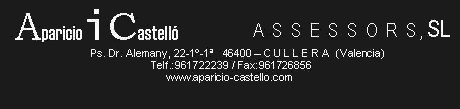 Aparicio i Castelló Assessors, S.L. - Assessoria de Empreses - Passeig del Doctor Alemany, nº22, 1ºpis, porta 1ª - 46400 – C U L L E R A (València) - Telèfon: 961722239 - Fax: 961726856